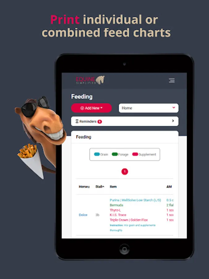 • Keep feed charts updated with unlimited feeds and supplements and provide specific feeding instructions. Print combined or individual feed charts