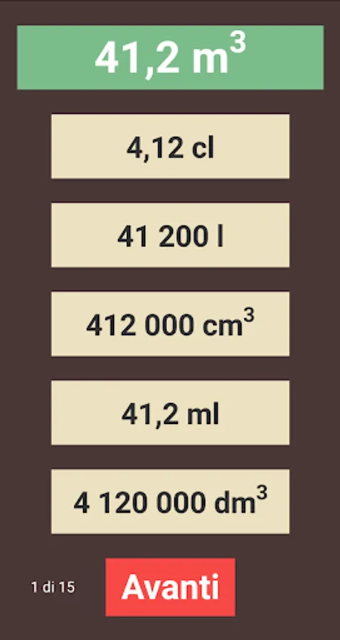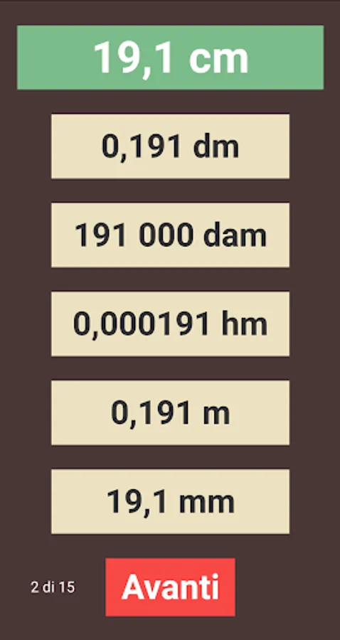 It often happens that you have to convert the measurement of a quantity into a multiple or submultiple of it; to do this, just remember the conversion factors. This program proposes multiple choice questions with unit scales of length, weight and capacity in order to verify the mental ability in making these calculations. Identify the correct equivalence by selecting it from those proposed.