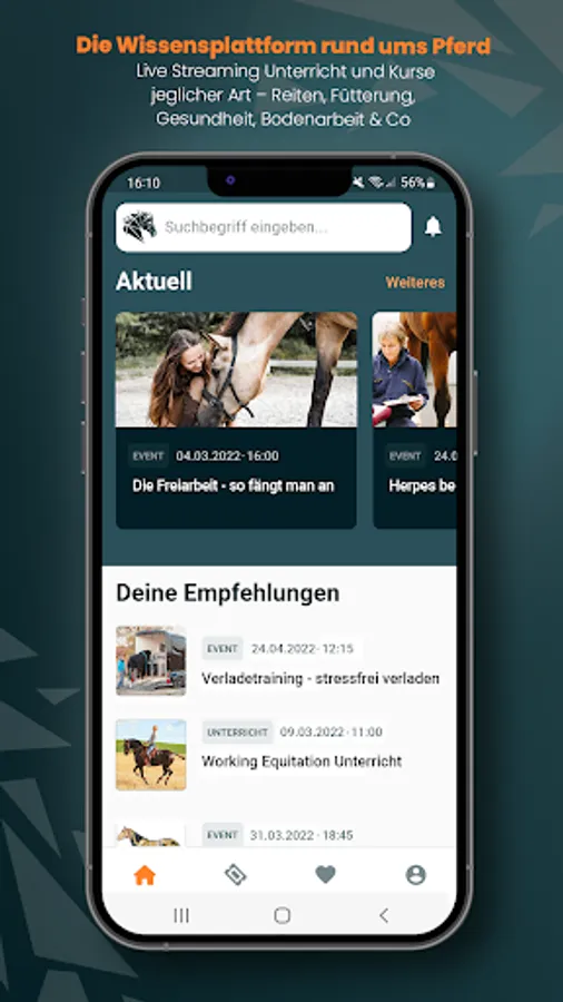 Whether dressage, jumping, western, working equitation or classic riding, we have all riding styles. Also specialist lectures and courses on ground work, equipment, shoeing, food, veterinarians, physiology, osteopathy and much more!
