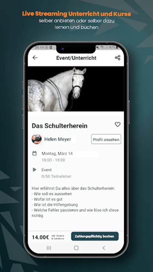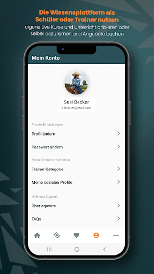b) Trainers to offer lessons or courses online yourself or to book lessons/courses with other trainers - the app is free for you! We only charge a usage fee after you have already generated income, which you enable through live lessons/courses via equwire!