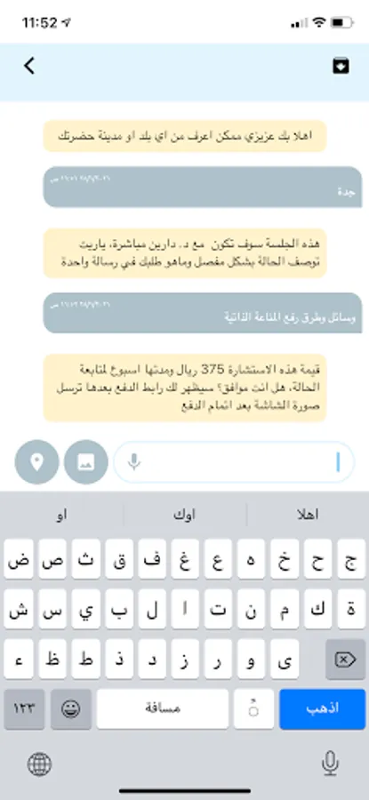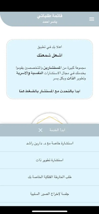 Psychological counseling advanced technologies such as Alsodgk and reflexology and meridians and a lot of science, family counseling, health, nutrition and yoga. All this from within the application and more.