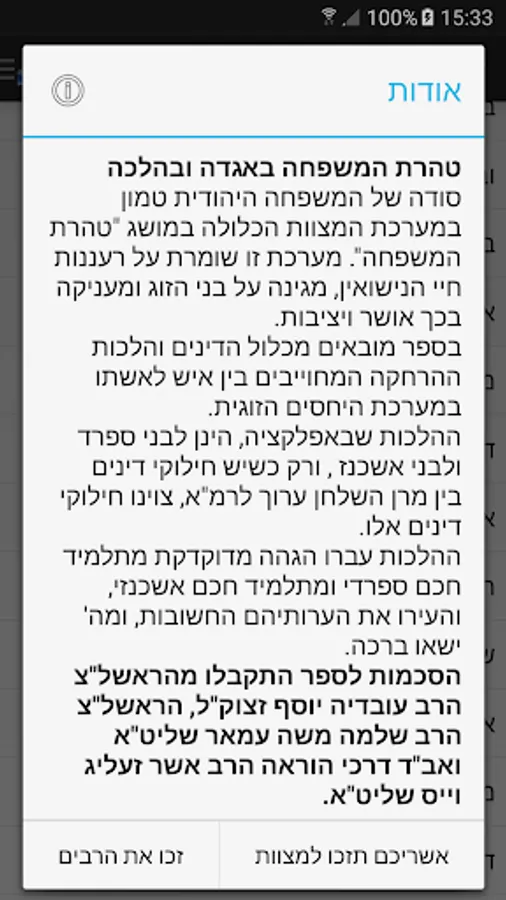 The Jewish religious laws (Halakhot) in the application are for Sephardim and Ashkenazim, and only when there are disagreements between the Shulchan Aruch and the Rema we mention these disagreements.