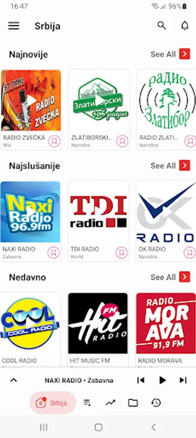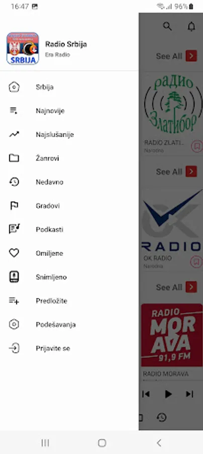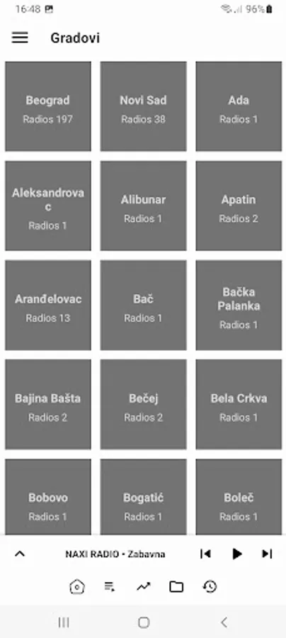 Aplikacija ima oko 500 radio stanica. Posle nekoliko najslušanijih, slede ostale po abecednom redosledu.