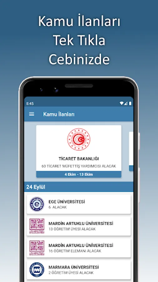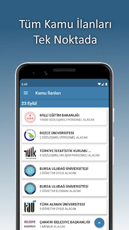 Public personnel announcements are now published from a single point via the "T.R. Presidency Strategy and Budget Department (SBB)". We present public advertisements for you. We offer public personnel recruitment announcements instantly to your service. You no longer need to navigate dozens of sites for public procurement. We notify you of public procurement and public job postings by sending a notification. You can follow the details of government job postings.