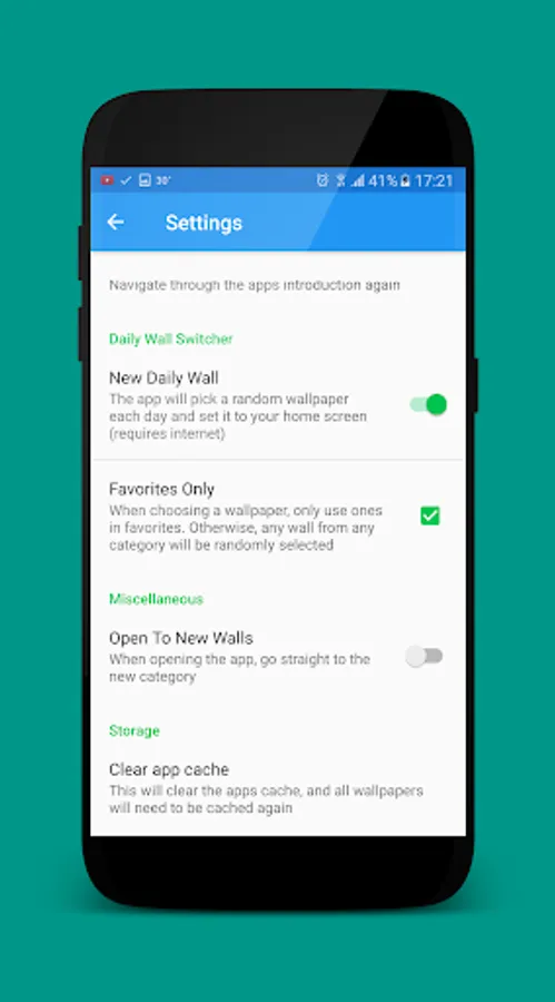 • Get a new wallpaper each day with the 'Daily Wall Switcher' (option to pick from all categories at random, or from favourites)