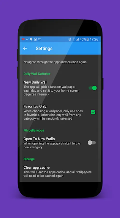 • The app also needs to start with your phone so we can re-schedule the 'Daily Wall Switcher' if you have it enabled! We wouldn't want you not getting a new wallpaper!
