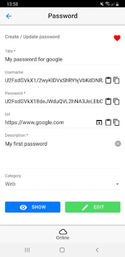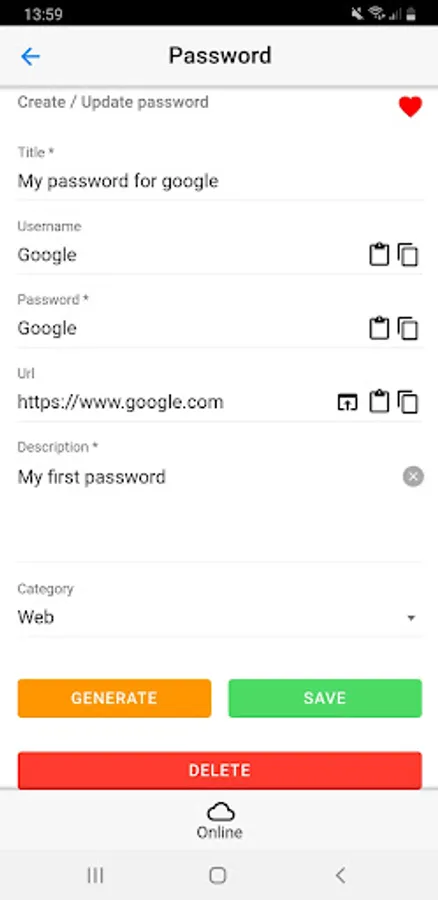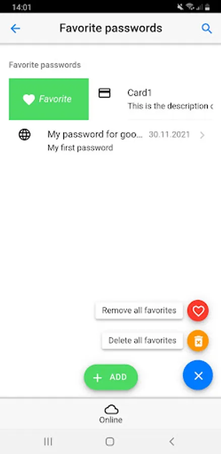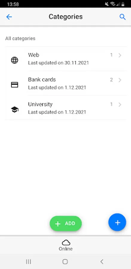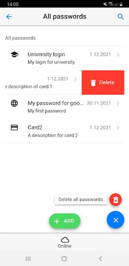 Users has two options when using this password manager application. These are Online and Offline mode. They are completely separeted from each other, and it is very easy and quick to switch between these modes. Users can use both modes together as they wish. The passwords and the usernames(if they have it) are always encrypted before saving.