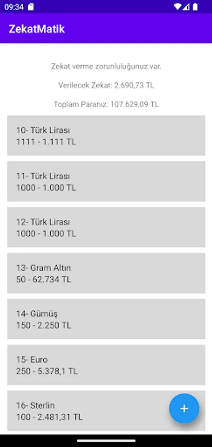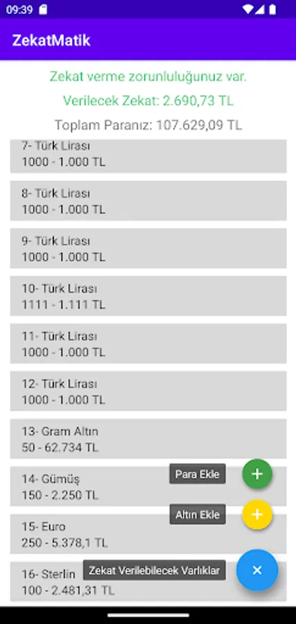 In our application, all currencies, all types of gold and silver information are entered and listed automatically with the current exchange rates, whether you will give zakat, how much TL you will give if you will give zakat, and your total amount of money is calculated in TL.