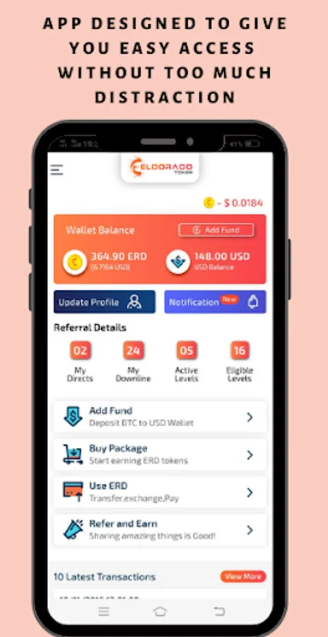 The Eldorado token Crypto wallet app is a User-friendly and secure android app that manages all the ERD token Crypto wallet operations. This Crypto app offers ERD wall et management and some exciting Crypto services using ERD tokens.