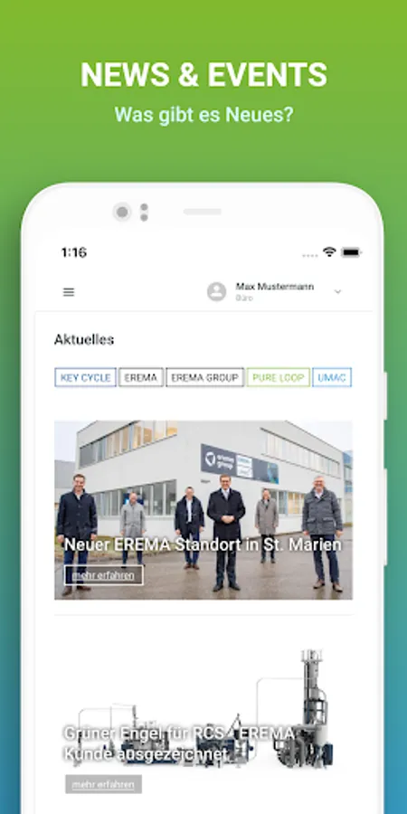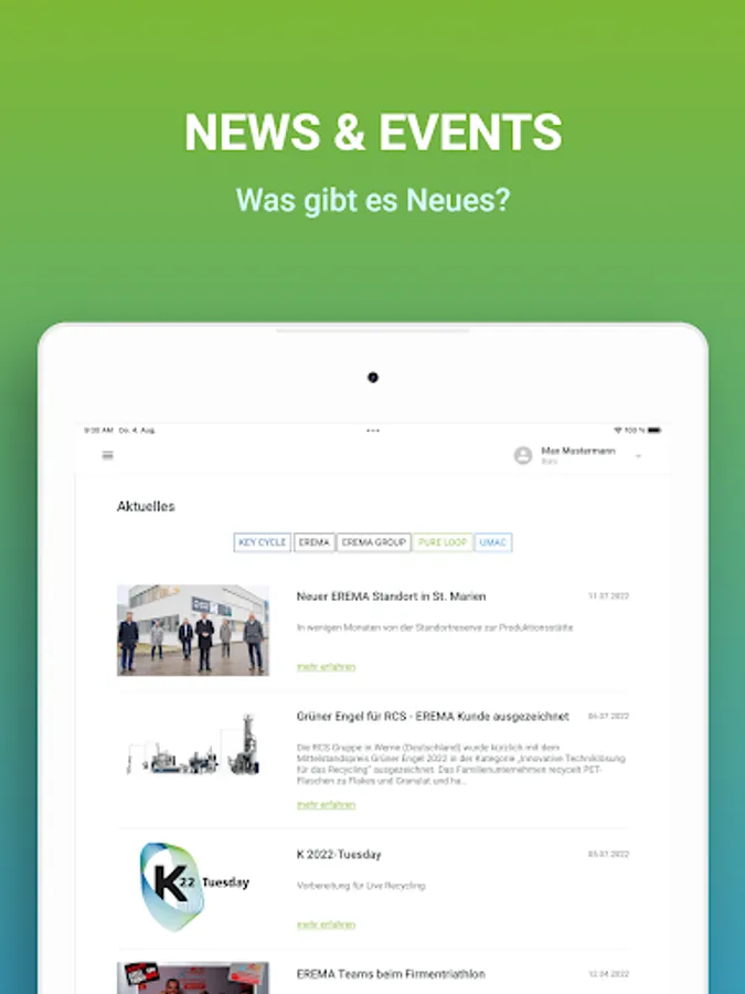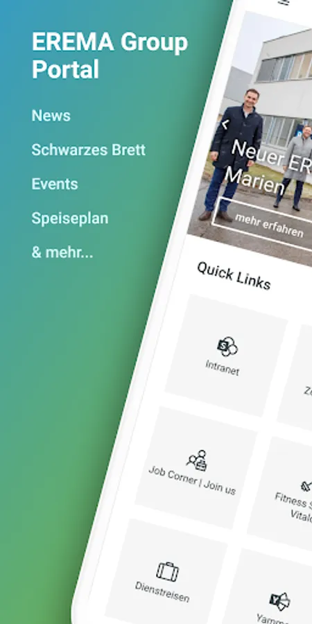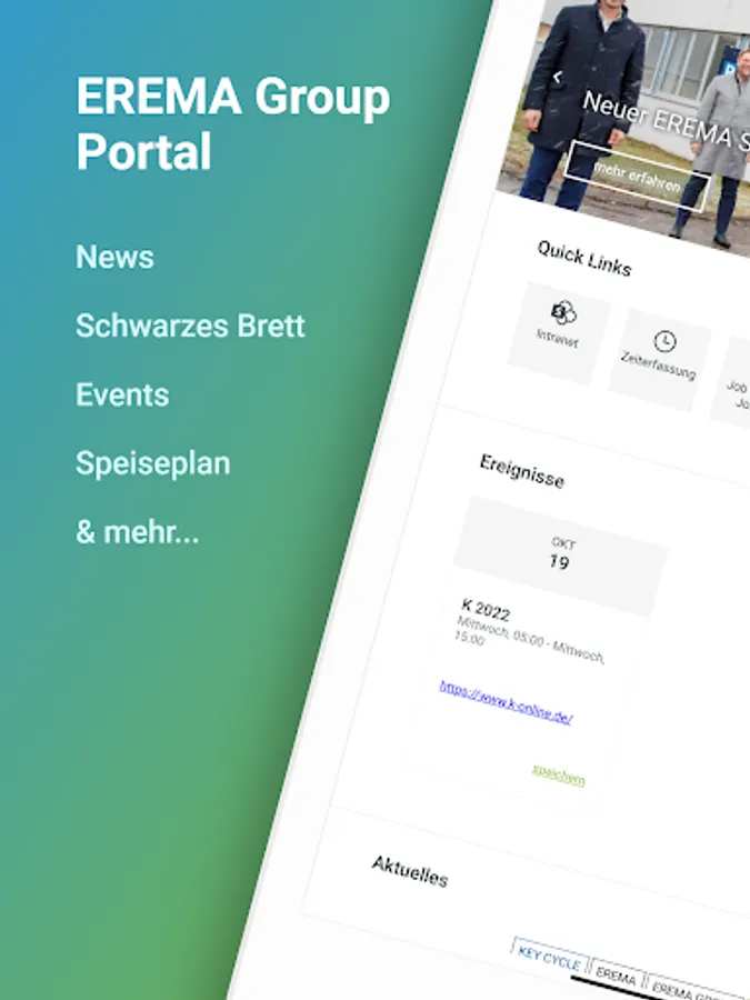 Employees of the EREMA Group can use this app to register for internal events, take part in surveys and exchange information, ideas and concerns with each other via the "Bulletin Board". An extensive news area provides information about internal news. With these and other features, such as the current menu of the company restaurant, the users of this app are always well informed. EREMA Group Portal - the app for employees of the EREMA Group.