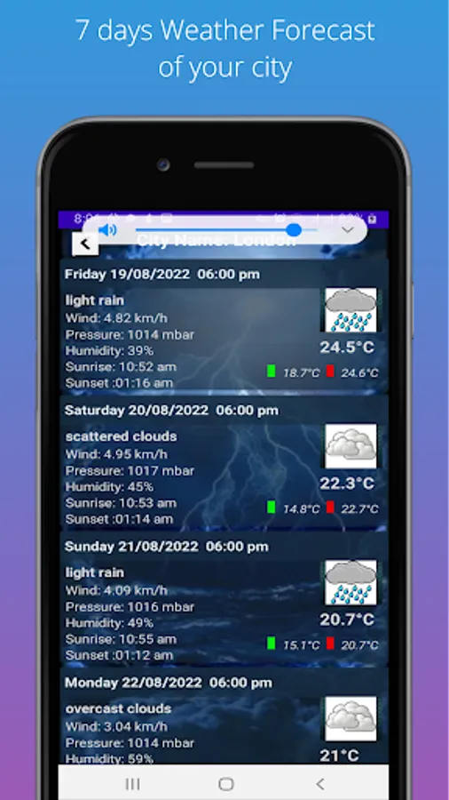 This app is very much helpful for travelers, those who travel to different places. Before visiting a new city, you just enter your city name and press the "GO" button on your mobile phone. It will automatically show you weather conditions for 7 days, which includes weather conditions, wind speed, pressure, Humidity, sunrise, sunset, the temperature at a particular time, Highest temperature, and lowest temperature. By using this app, people can take preparation ahead of time before leaving for a new city. Moreover, this app will give you data on weather conditions and the temperature of your current location. If you think this app is helpful, please refer it to your friends and colleagues