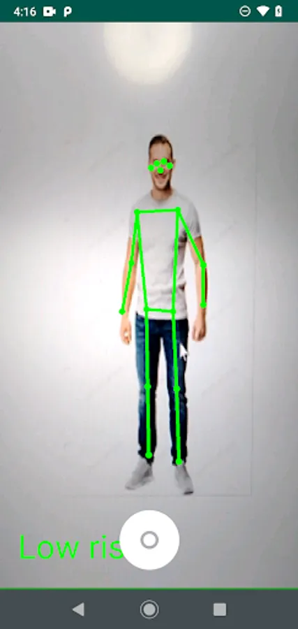 This app detects a single person on a screen and evaluates REBA for that person. Based on REBA it classifies the activities into “low risk”, “medium risk”, and “high risk” and it shows the skeleton green, yellow and red, correspondingly.