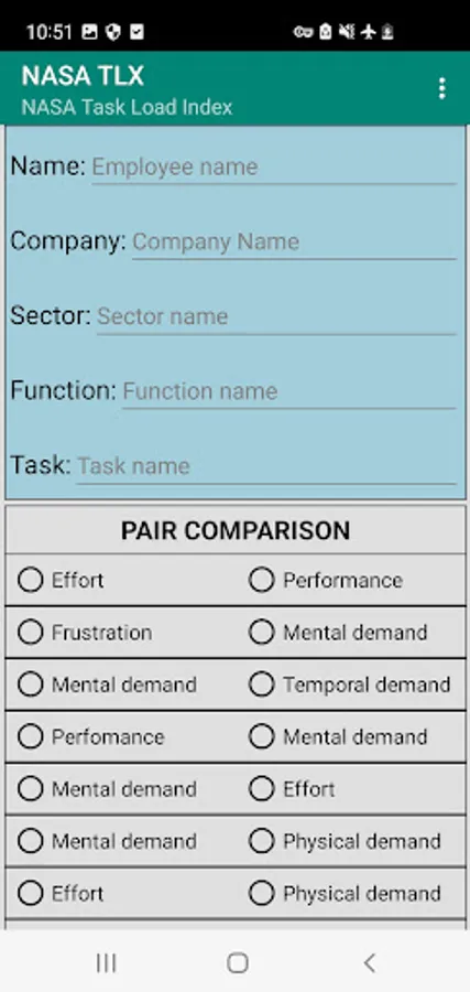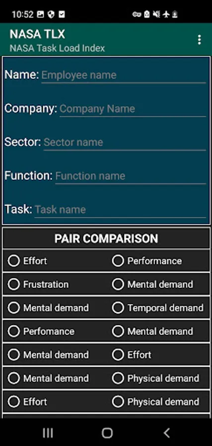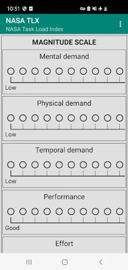 NASA-TLX originally consisted of two parts: the total workload is divided into six subjective subscales that are represented on a single page, serving as one part of the questionnaire: