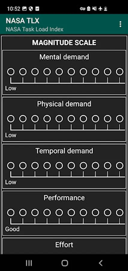 There is a description for each of these subscales that the subject should read before rating. They are rated for each task within a 100-points range with 5-point steps. These ratings are then combined to the task load index.