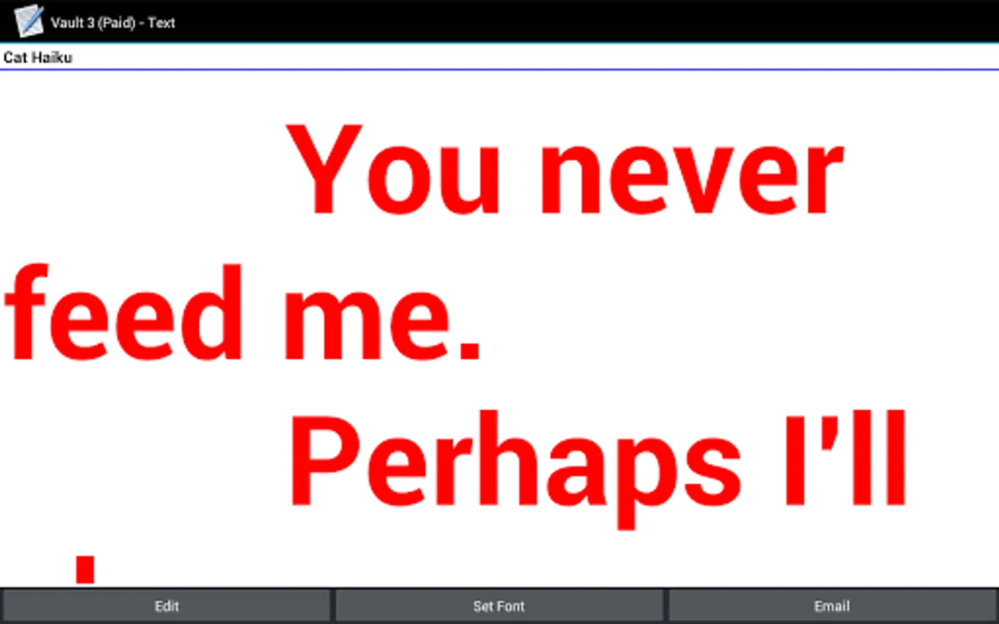 Vault 3 Outliner stores your notes as a searchable outline. Vault 3 organizes your information into categories and sub-categories that you specify. Vault 3's outline is easily and rapidly searchable. Vault 3 uses strong encryption to ensure the privacy of your personal data. Vault 3 runs on Android phones and tablets.There are no limits to the size of Vault 3 documents or to the nesting depth of outline items. Vault 3 gives you convenient and secure access to all of your notes.