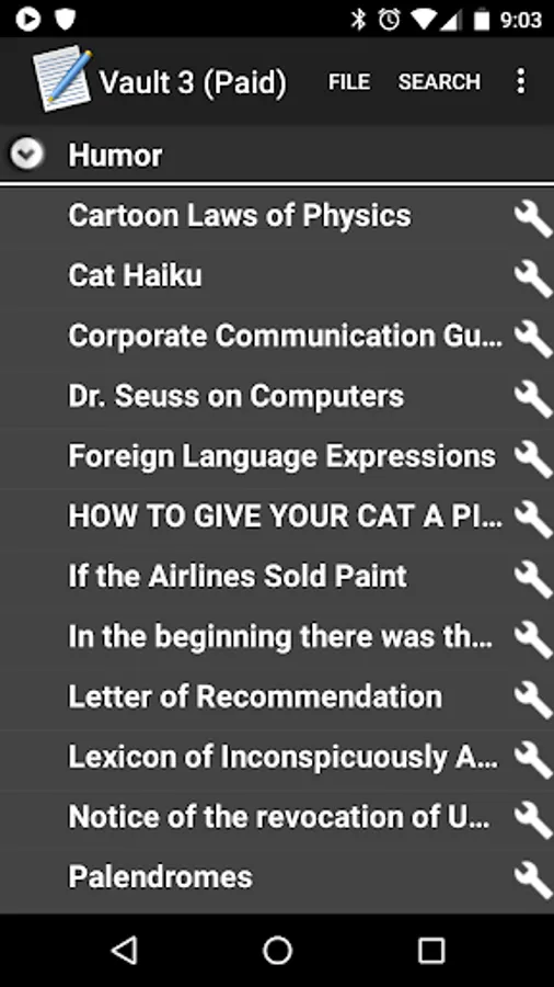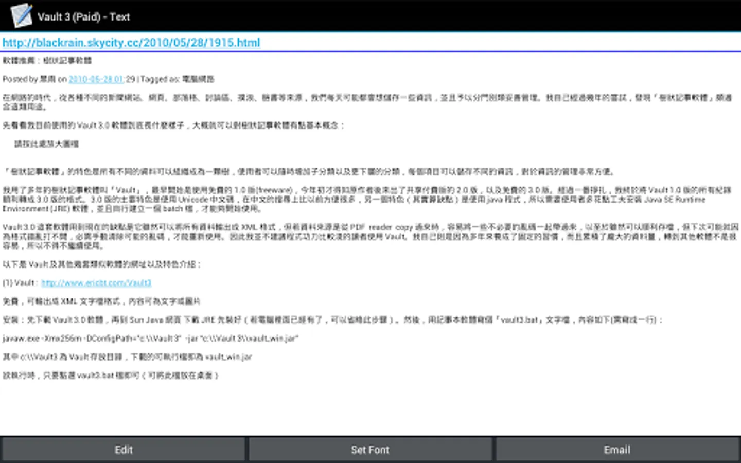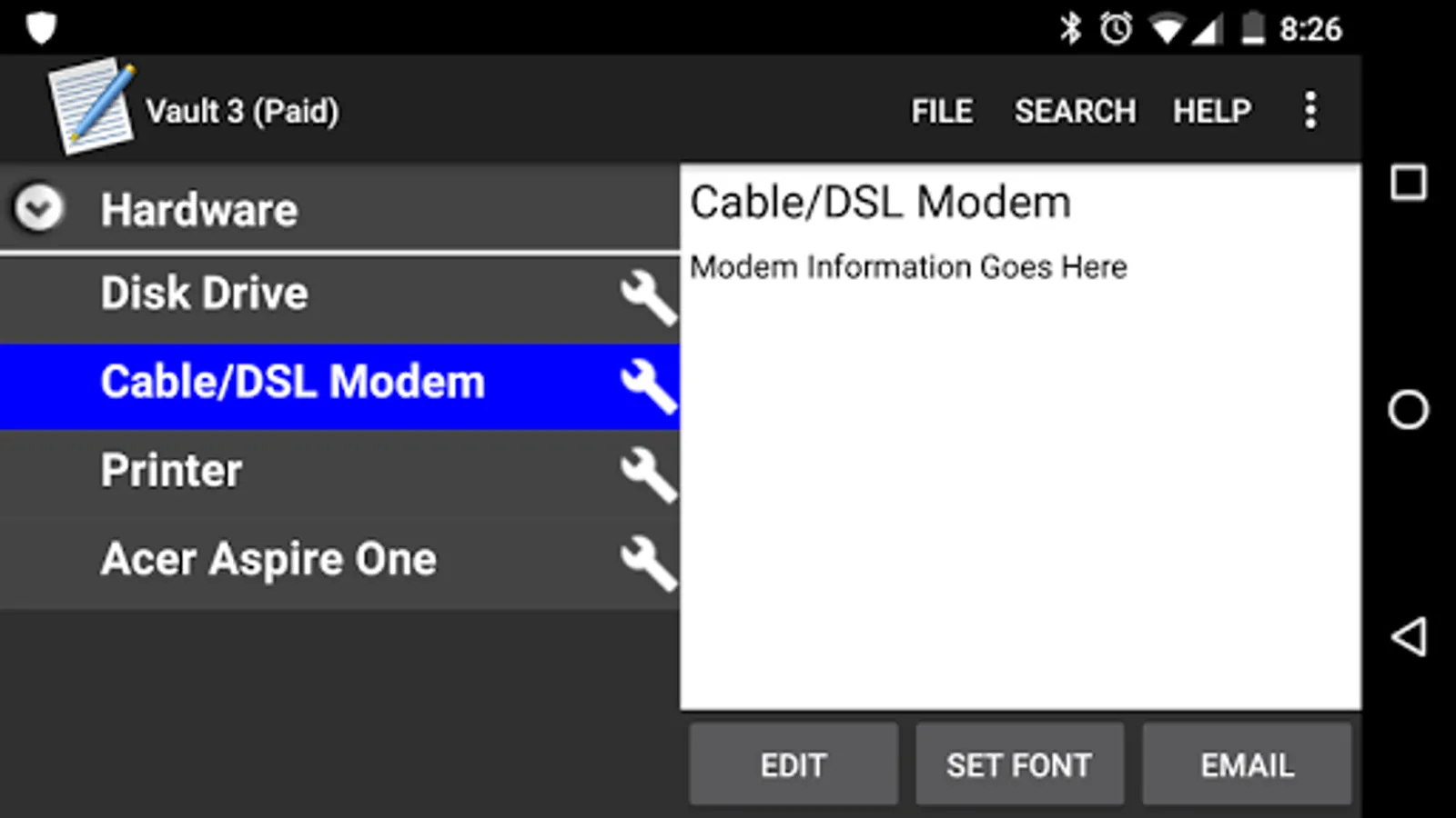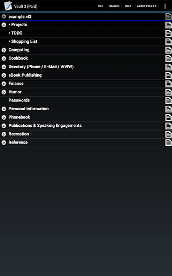 Vault 3 Outliner stores your notes as a searchable outline. Vault 3 organizes your information into categories and sub-categories that you specify. Vault 3's outline is easily and rapidly searchable. Vault 3 uses strong encryption to ensure the privacy of your personal data. Vault 3 runs on Android phones and tablets.There are no limits to the size of Vault 3 documents or to the nesting depth of outline items. Vault 3 gives you convenient and secure access to all of your notes.
