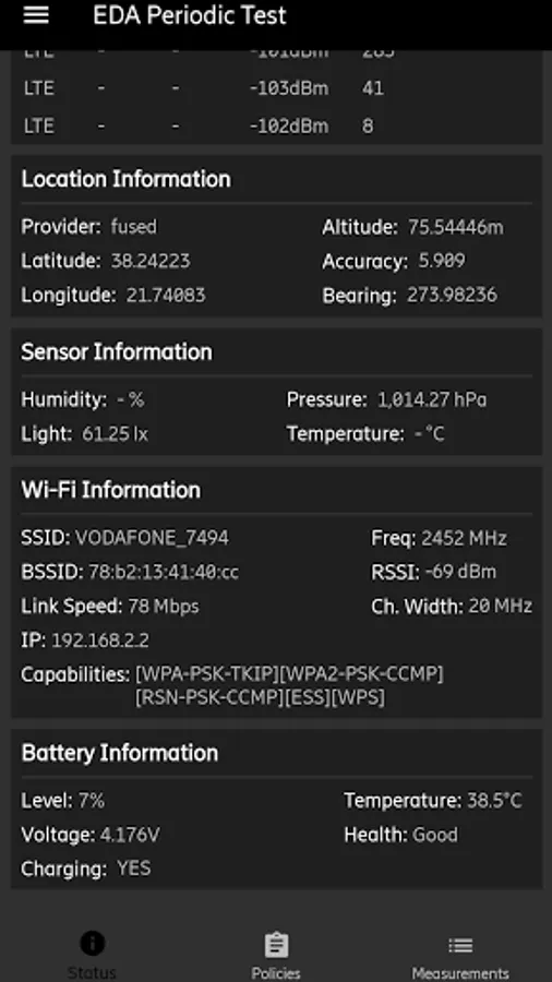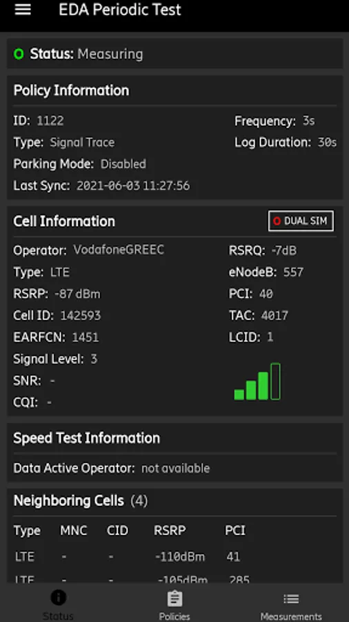 Measurements execution is triggered from EDA Web portal. In more detail, EDA user can perform periodic speed test measurement scenarios (policies) (Downlink, Uplink, and Latency) towards EDA dedicated measurement servers. EDA app can extract radio & sensor information (Signal Trace Policy). When the measurement is completed, EDA App will generate a measurement report and send the measurement log to the data streamer. Finally, the measurement data can be in various ways visualized (geomapping, speed plotters, bar charts) via the GUI EDA Visualizer hosted on EDA Web portal.