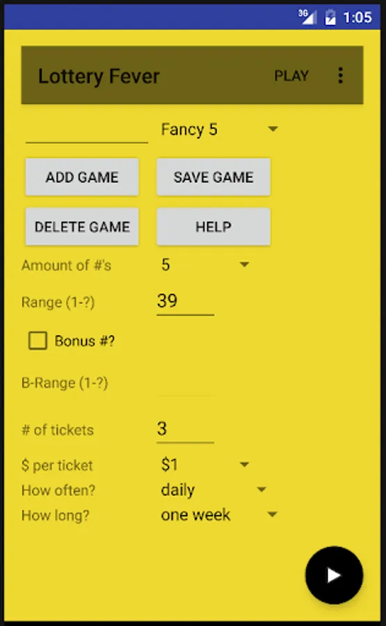 This is a tool that lets you pick from one of three different games, or make a custom game of your choice, where you pick the ranges, price per ticket, number of tickets per game, whether there's a bonus number, how often you want to play, how long, and more. You also choose your lucky numbers or have numbers randomly generated. You select payouts, whether multipliers or set numbers such as jackpots.