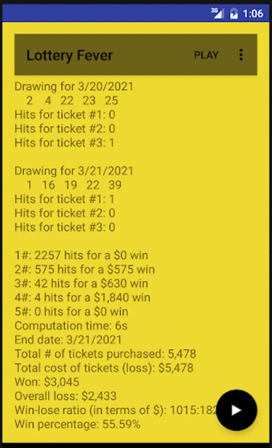 You then play the game, which will run the numbers, which calculates a set of statistics for you, including the win-lose ratio, win percentage, last date you bought a ticket, date of jackpot (if you play "until jackpot"), number of hits per each number combination and amount of wins, frequency of numbers selected, etc.