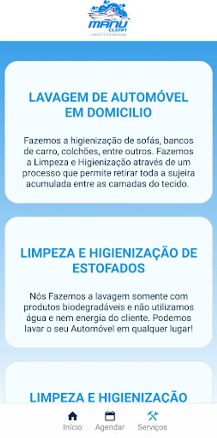 The Manu Clean application provides an online schedule for Home Cleaning and is the perfect solution for those looking for convenience and practicality in cleaning and sanitizing vehicles. With just a few clicks, users can schedule and enjoy a professional cleaning service from the comfort of their own home. (Available only in the Region of Caraguatatuba)