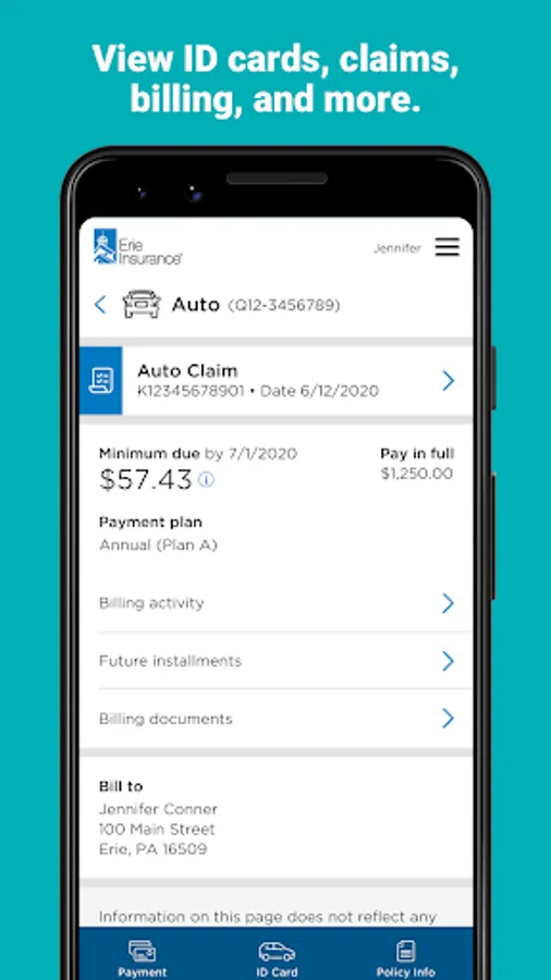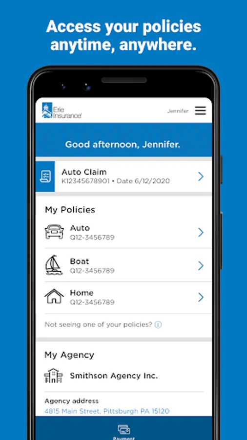 At ERIE, we’ve been Above All in Service since 1925. You can count on us to provide auto, home, life, and business insurance you trust. With ERIE’s mobile app, ERIE customers with an Online Account can easily and securely access important policy information from your mobile device. Here’s what you can expect from our app.
