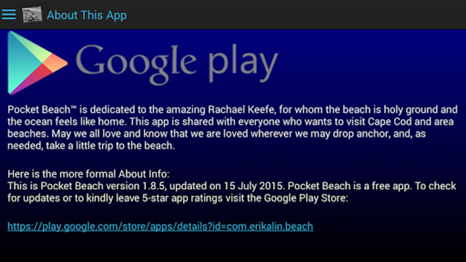 Pocket Beach was made as a gift to Rachael Keefe, because she moved from New England on to other shores, to do new things. Created by Erika Sanborne, a U.S. Coast Guard veteran who also loves the ocean. The app is shared as a companion for anyone who wants to virtually visit some beaches.