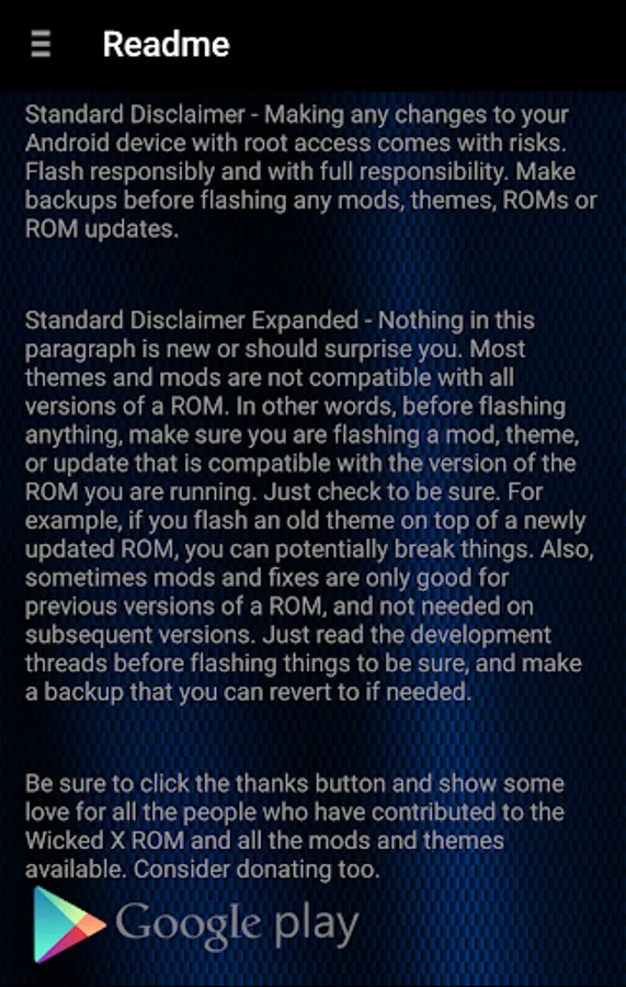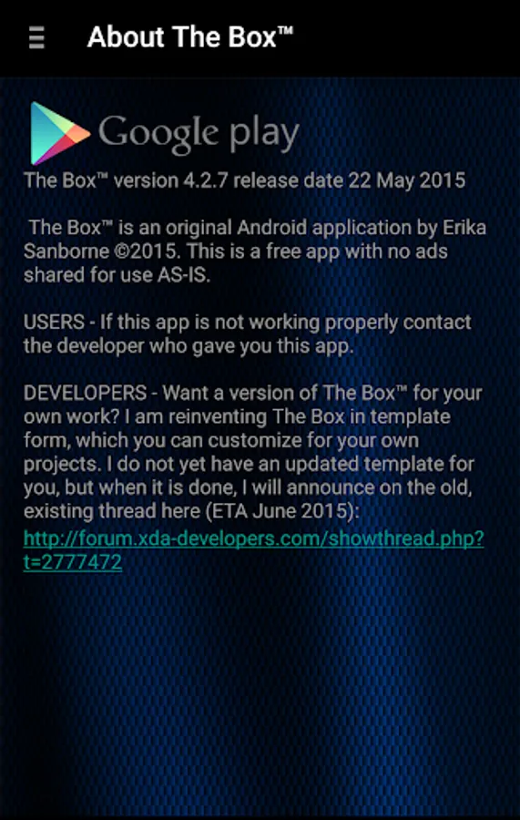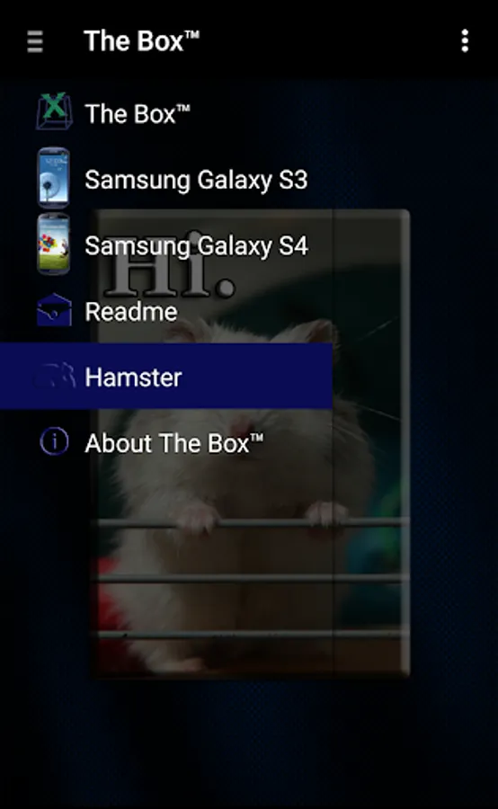 This is a simple app for users of Wicked X on the Samsung Galaxy S3 and the Samsung Galaxy S4, a ROM by bilgerryan (see development threads here: http://forum.xda-developers.com/showthread.php?t=2750674, http://forum.xda-developers.com/galaxy-s4-sprint/development/rom-wicked-x-v9-0-t3086132). The Box is a one-stop-shop for ROM updates, themes, and other modifications, as well as connection to a community on XDA. Check it out. Thank the developers and themers for their good work.