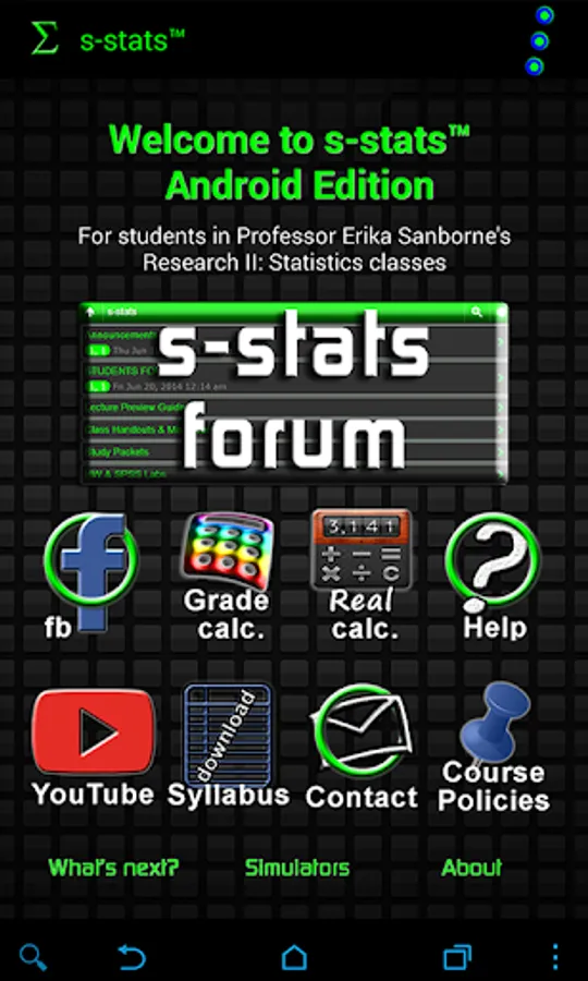 Welcome to s-stats Pro. This app is intended to be useful exclusively to students in Professor Erika Sanborne's Research II: Statistics for Psychology courses in the current semester. **If you are not enrolled in my class, then this app will be of no use to you.**