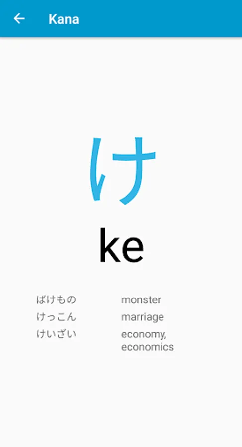 * Individual cards for every kana with examples of words where it used.