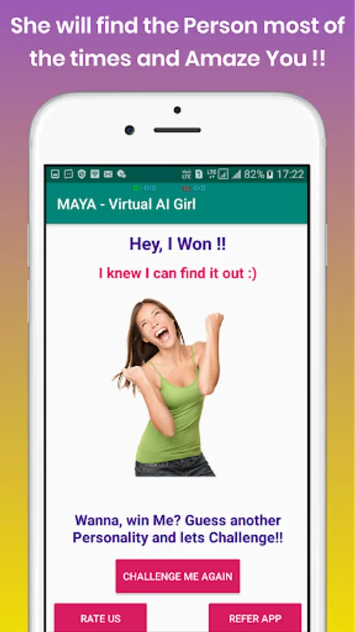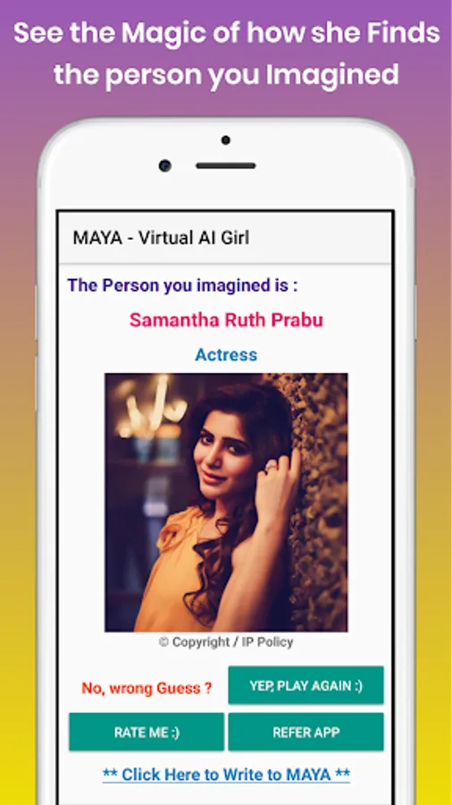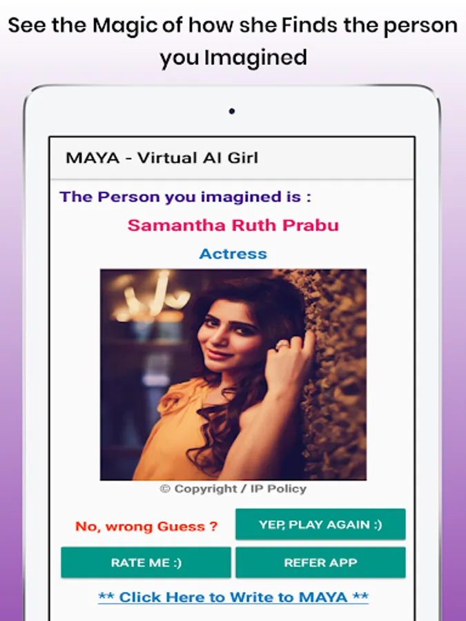 This Game is inspired from the old Fun and Cool Game - 21 Questions or Grand Master puzzle which is a primitive Guess the Person Game. This Mind Reader will guess person and make you play More with Her :) So Maya's Magic awaits you !!