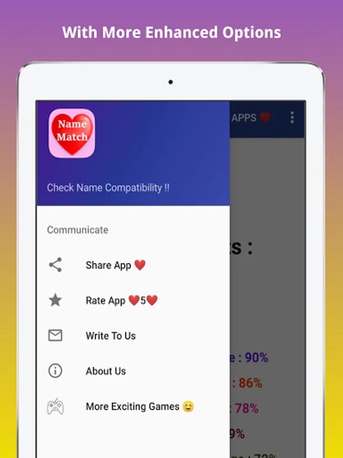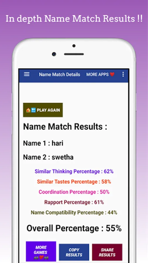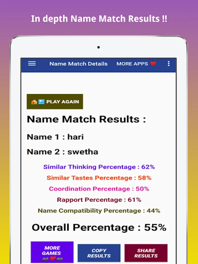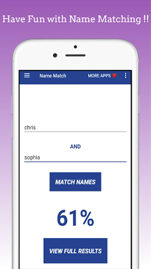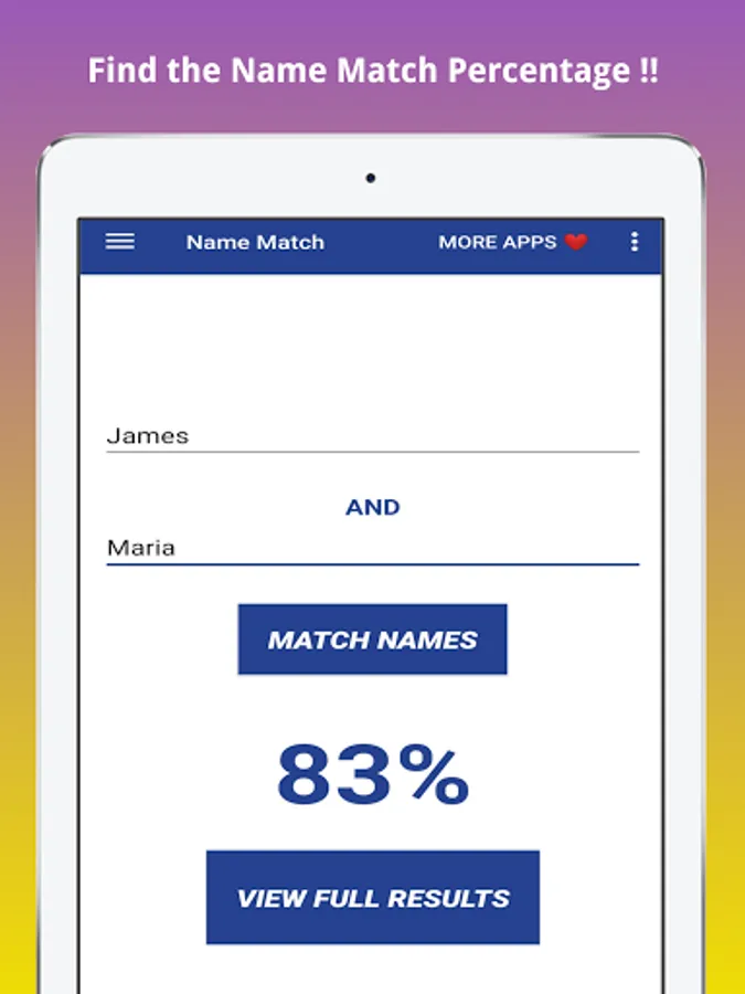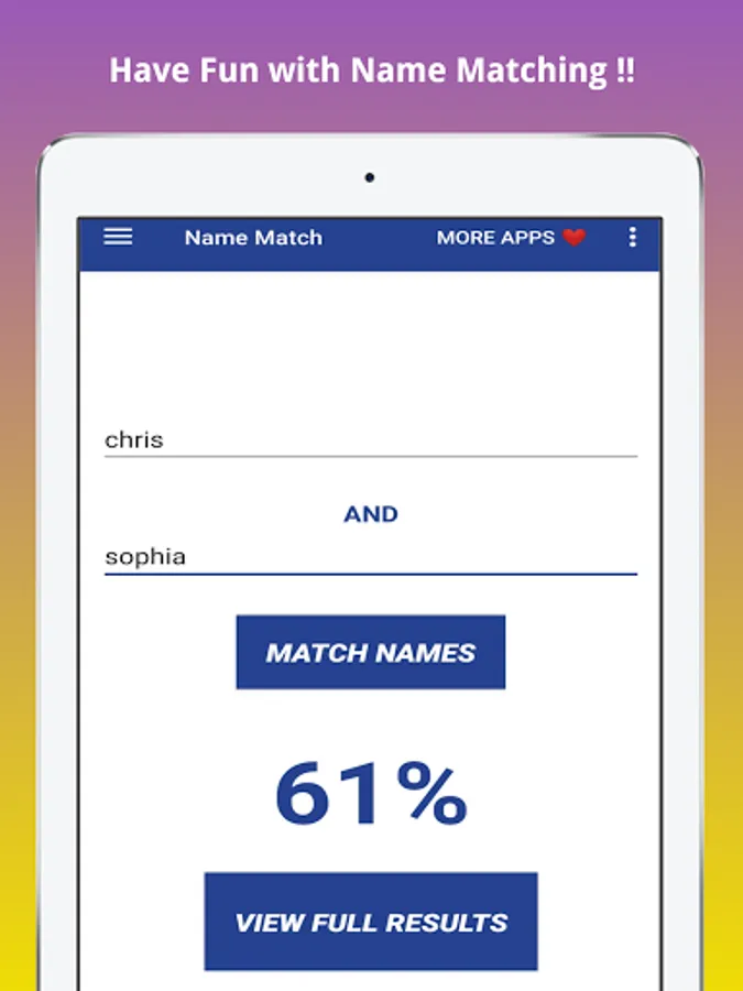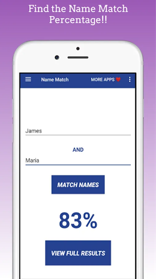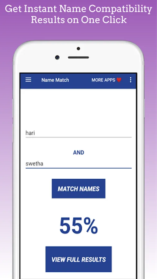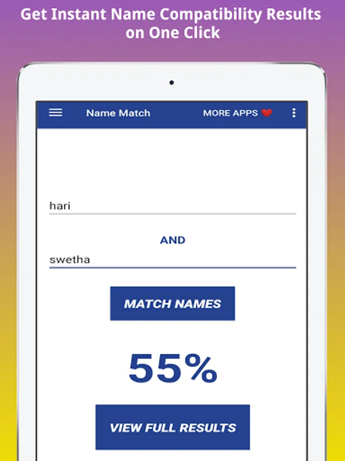 Get Name Match percentage between 2 names to check Compatibility. This app will compare 2 names and give the name match percentage.
