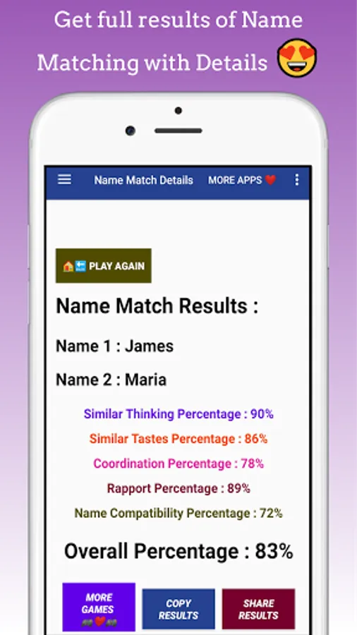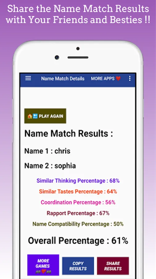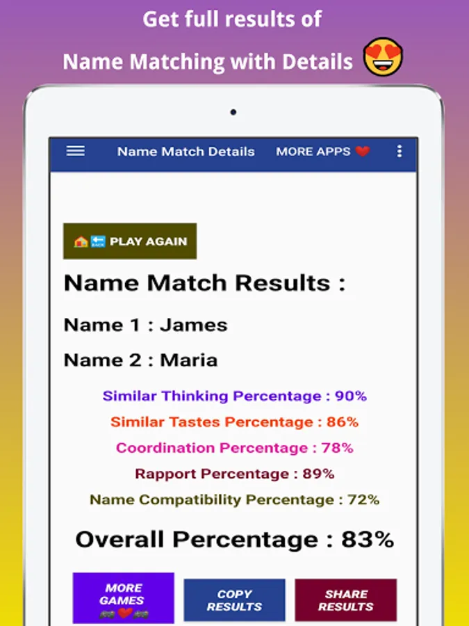 Share your Name match results to Your Friends and Besties and have fun with name matching.