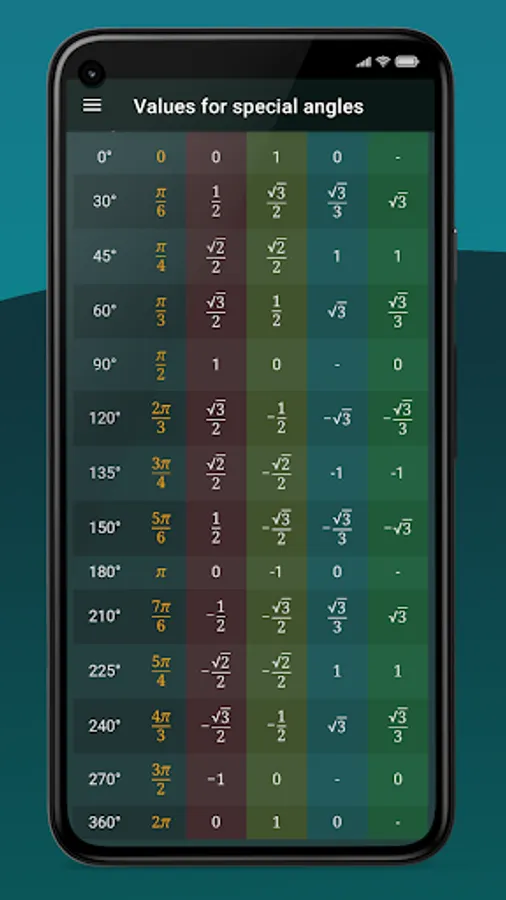 • Table of values for special angles