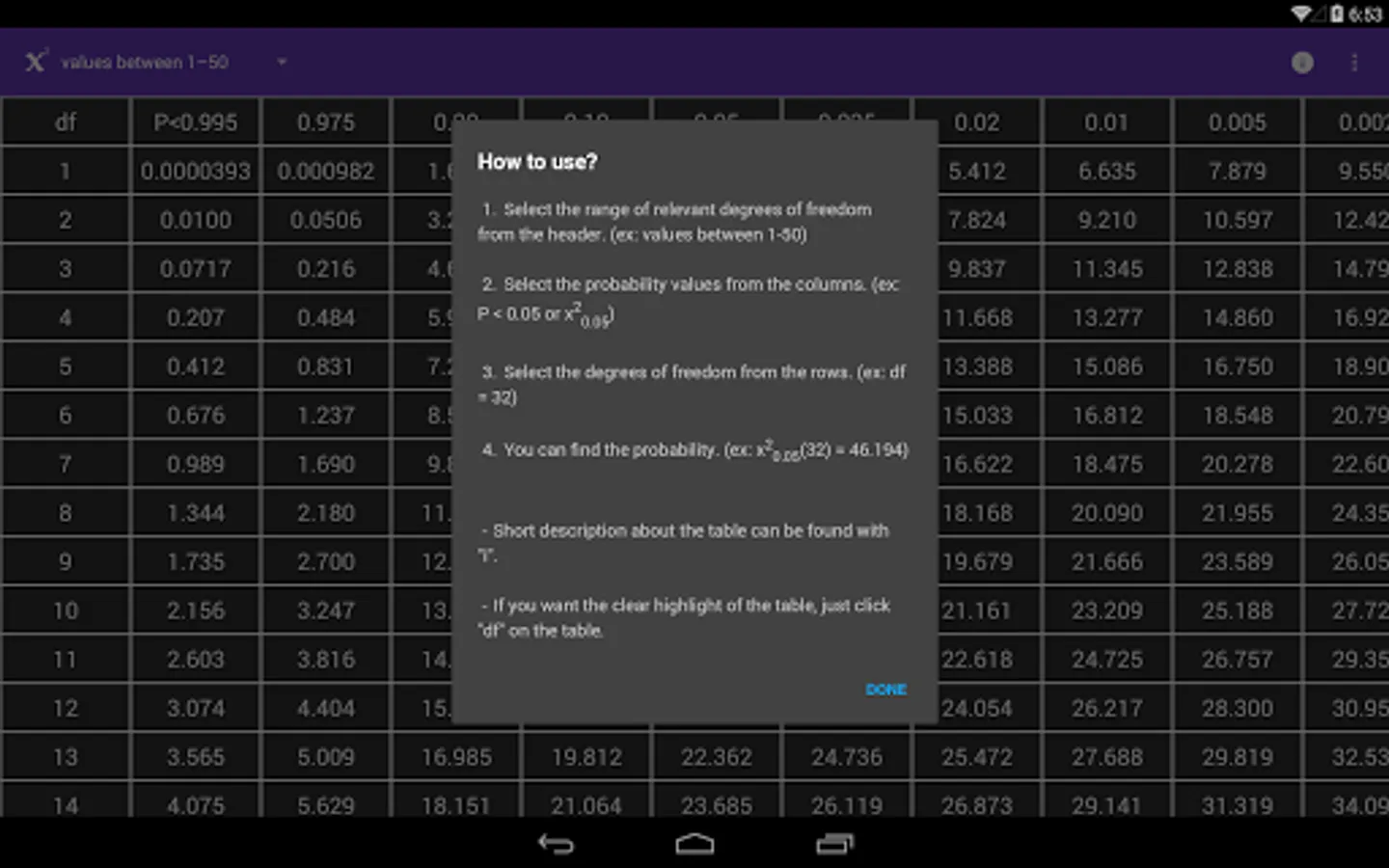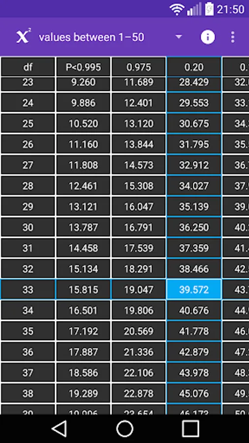 "Chi-Square Table" application is developed to provide easy and accurate information to users. You can find all Chi-Square critical values on a single app and easy to use table.