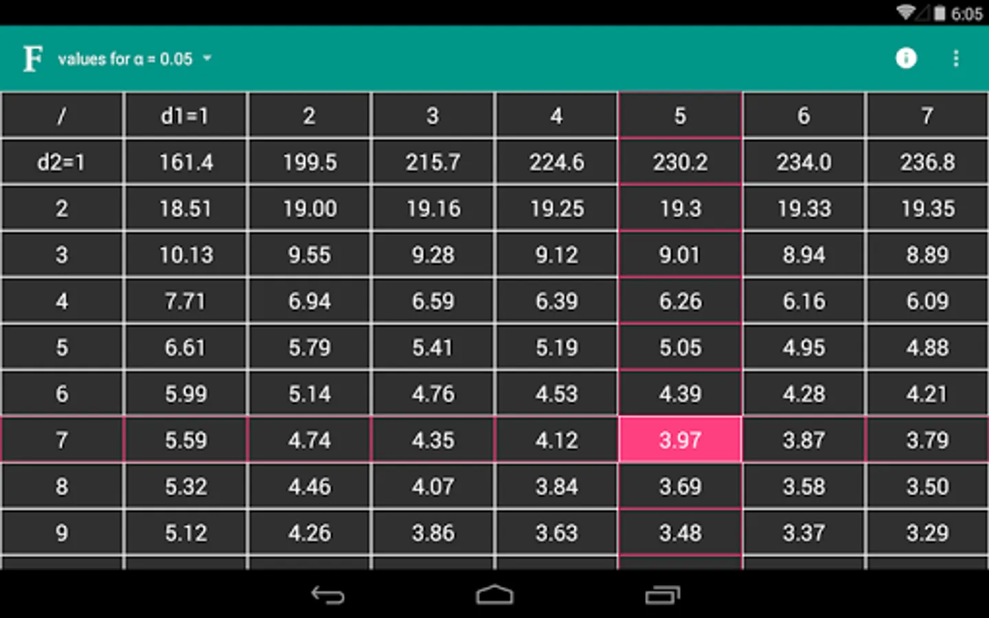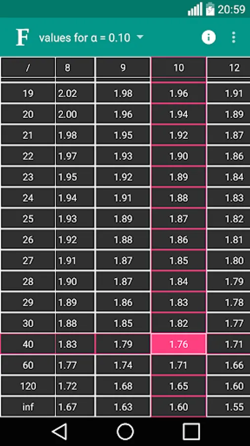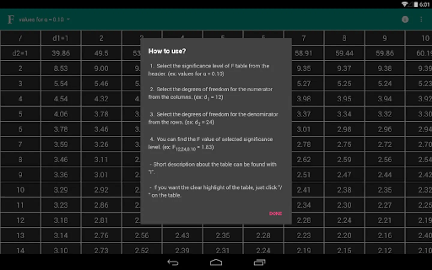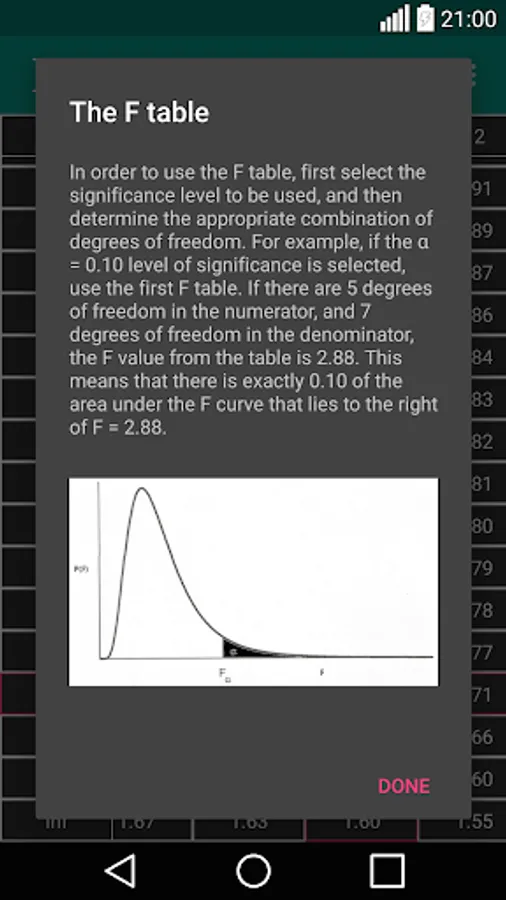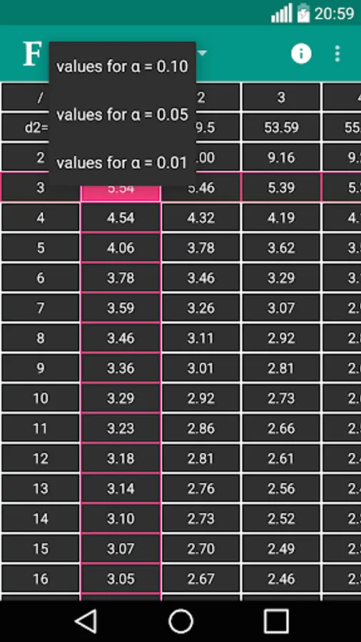 "F table" application is developed to provide easy and accurate information to users. You can find all F critical values on a single app and easy to use table.