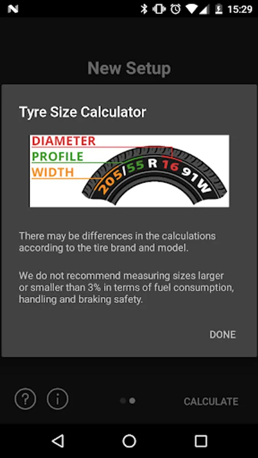Tyre Size Calculator application can be benefited in quality concerns and tyre-car sector. It includes basic explanations and calculation of tyre size.