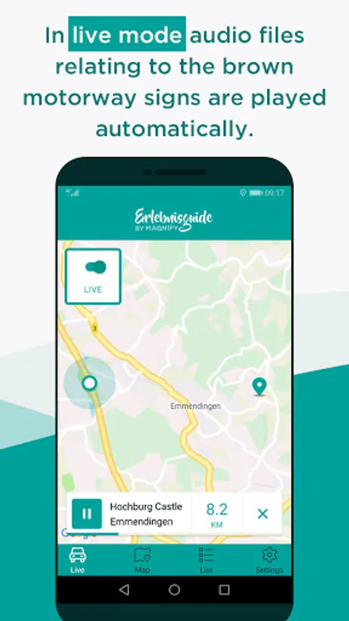 Turn your next motorway journey into an exciting adventure. The Experience Guide is your live audio tourist guide for when you’re out and about. At every* brown information sign along your route, you will automatically receive a short account of the nearby sights and places of interest. In the Experience Guide, all* locations are displayed on an interactive overview map or in the clearly arranged list. The more detailed premium sights feature practical links to websites and tourist information next to the text and images.