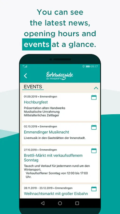 Festivals, concerts, markets and castle pageants – there’s a countless variety of leisure opportunities in Germany. Many premium sights present their annual event highlights directly in the app. It’s also easy to save your favoured events directly to your personal calendar.