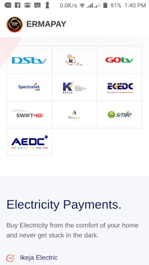 Buy Electricity, pay bills and transact from the comfort of your home and never get stuck in the dark with ErmaPay
