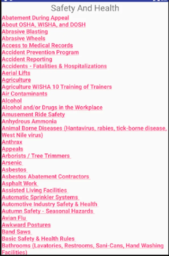 The user clicks "Safety & Health" button the app shows all "Safety & Health" topics by Alphabetical order (A-Z).
