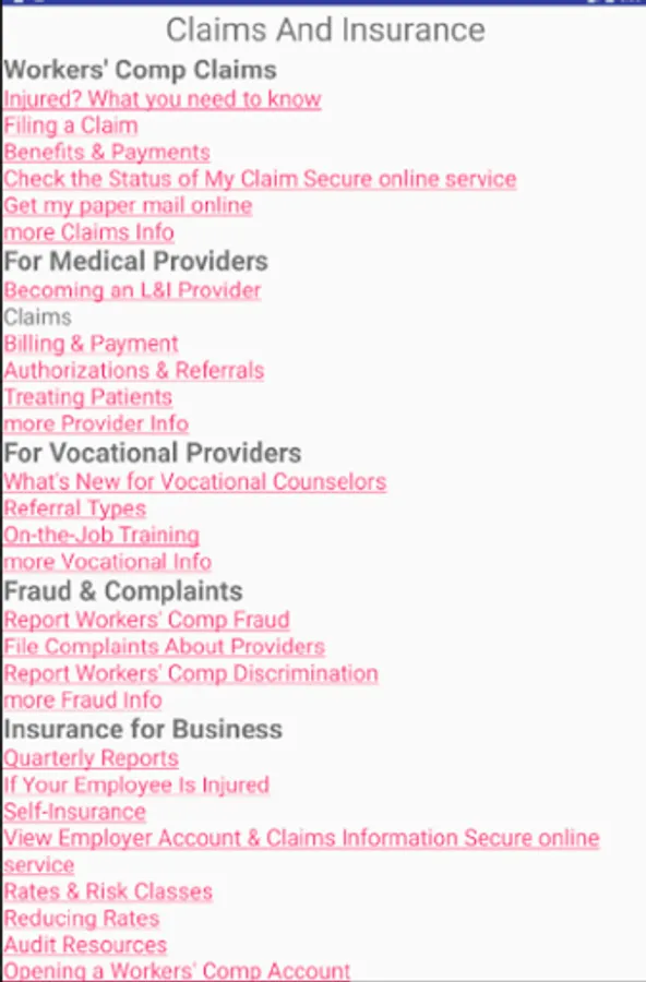 The user clicks other buttons("Claims & Insurance" , "Workplace Rights" or "Trades & Licensing") the app shows by categories.