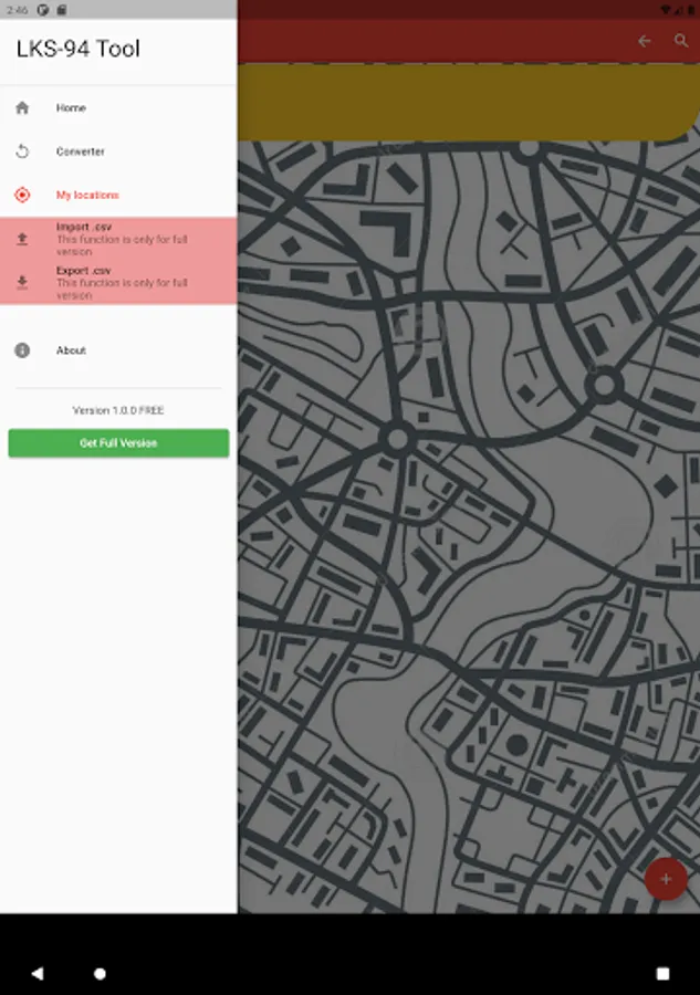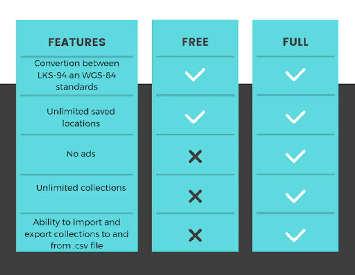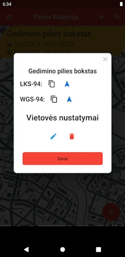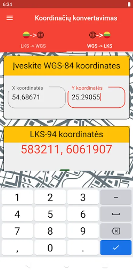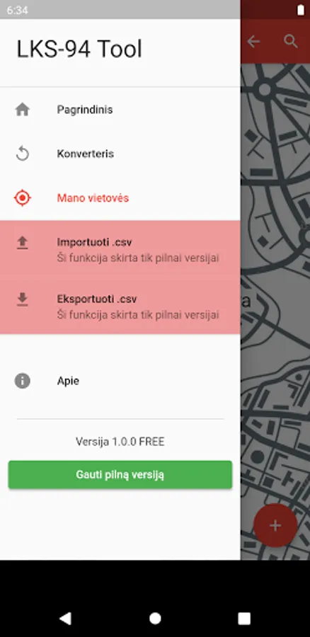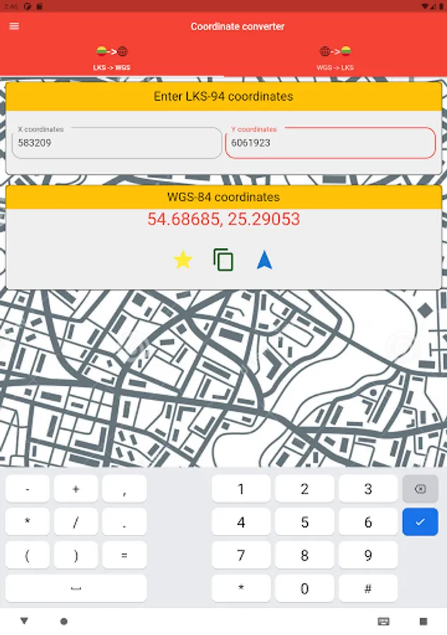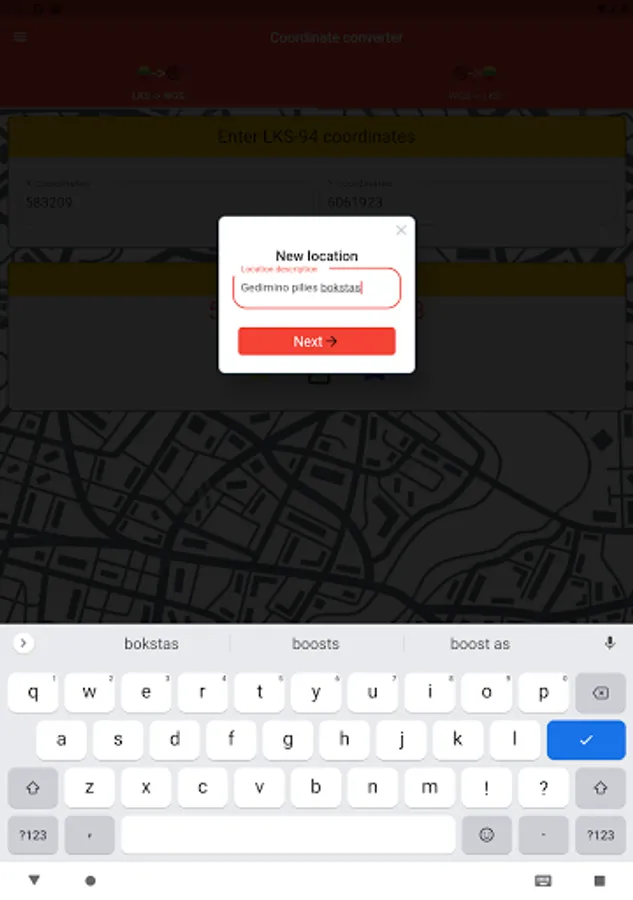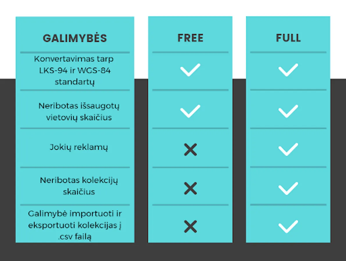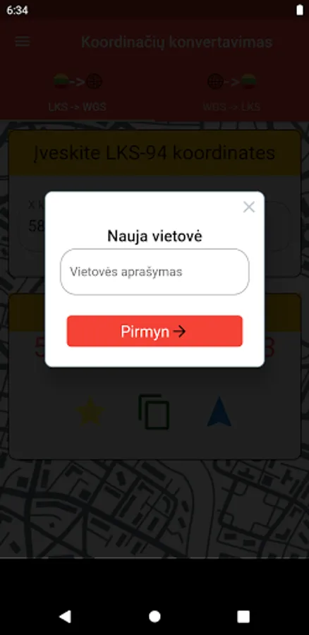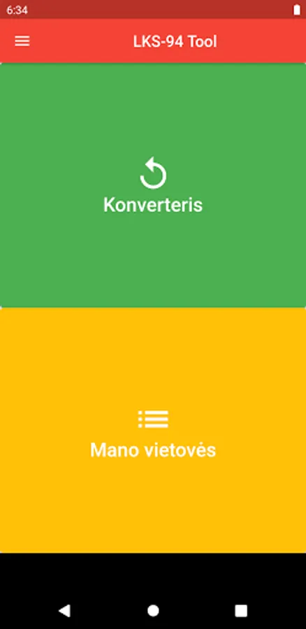 This app is for converting coordinates between LKS-94 and WGS-84 standards. User can save their coordinates and group them into collections. Saved locations may be exported to CSV file. Locations can also be imported from a chosen CSV file in users device.