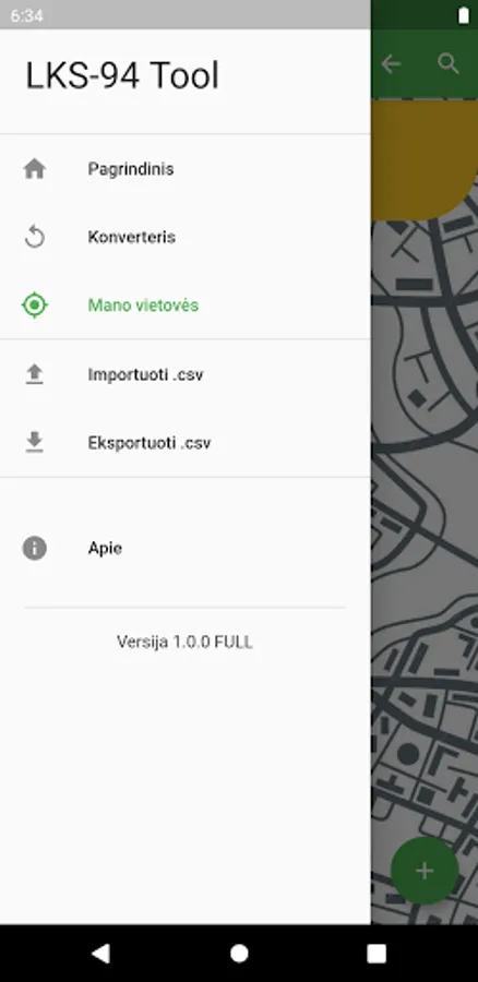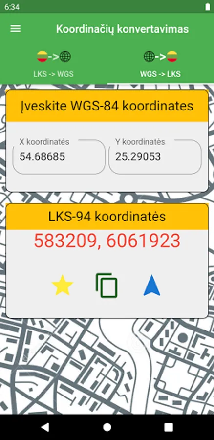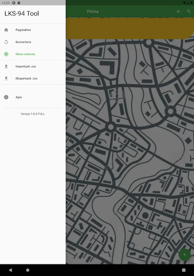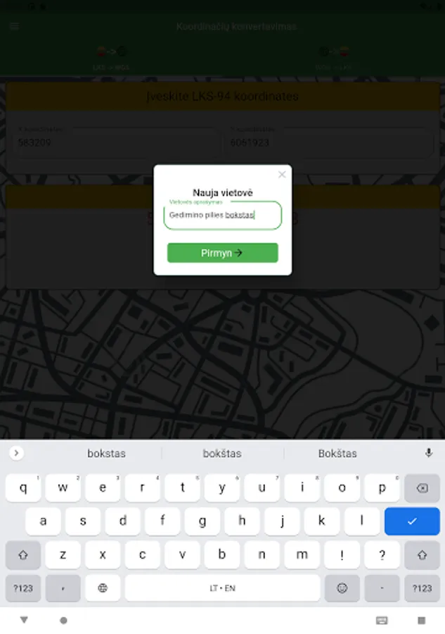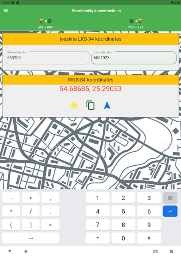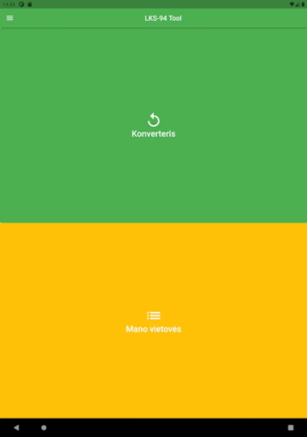 This app is for converting coordinates between LKS-94 and WGS-84 standards. User can save their coordinates and group them into collections. Saved locations may be exported to CSV file. Locations can also be imported from a chosen CSV file in users device.