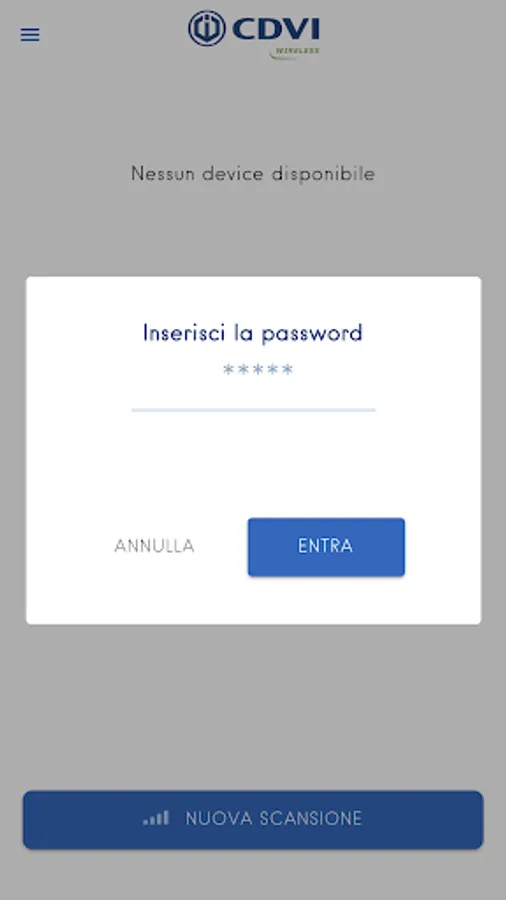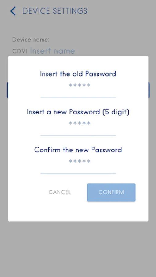 The connection to each device, whose name can be edited, is authorized by a password of 5 alphanumeric characters.