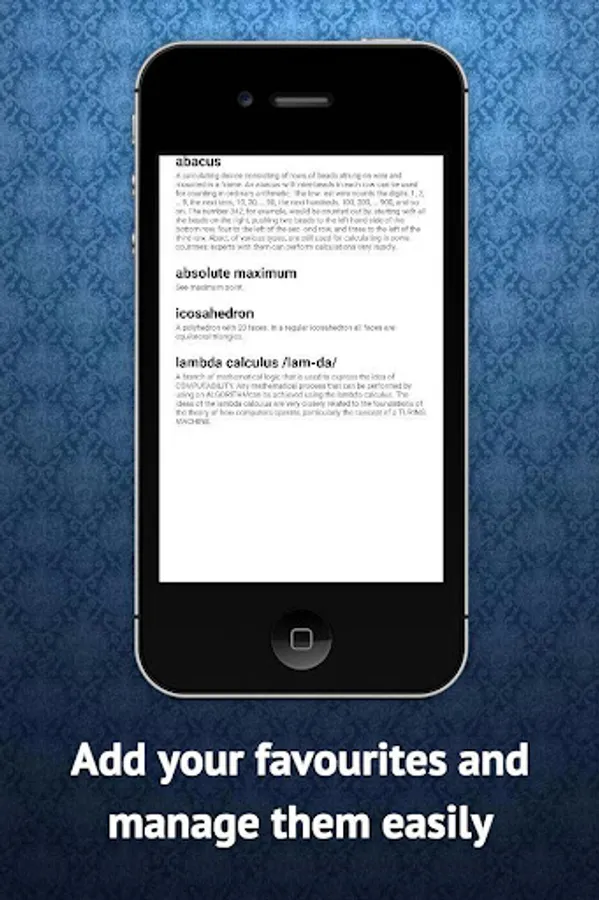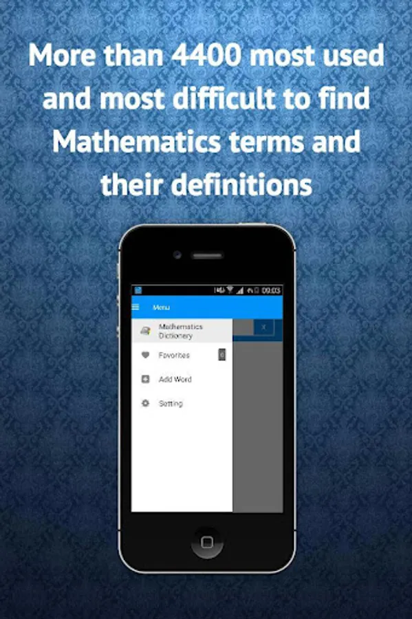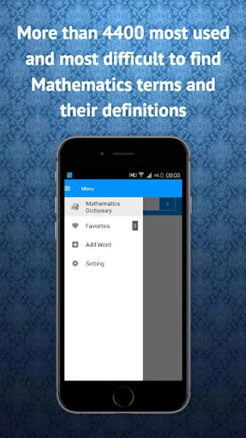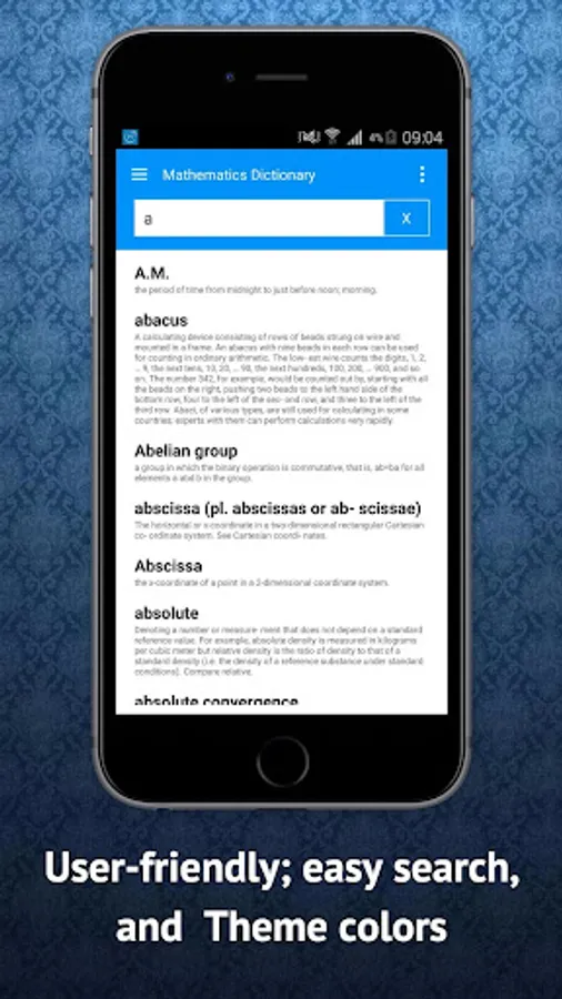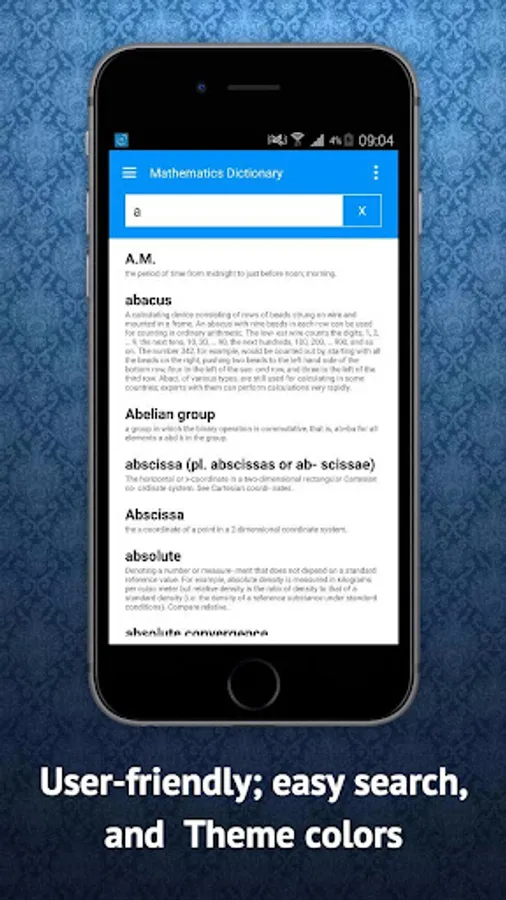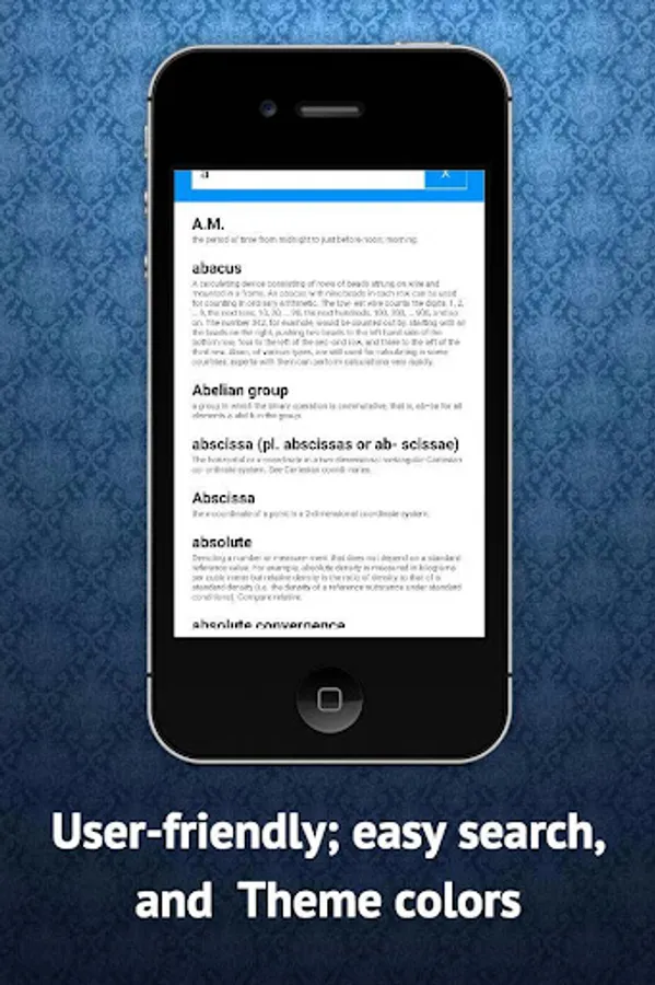 Mathematics Dictionary contains 4,400 of the most frequent but however most difficult to find mathematical terms, expressions and idioms used by mathematicians and those scientists making detailed use of mathematical calculations (e.g. physicists) with clearly understandable definitions, everywhere off-line, without internet connection.