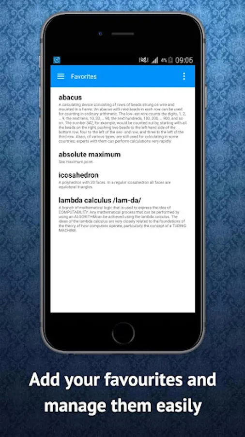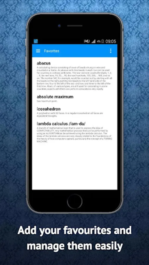You can determine some terms as your favorites and collect them separately. This feature can be managed easily. If there are terms, expressions or idioms which you would like to add, do it, so that you can look them up, whenever you want. Thanks to the unlimited ability of adding new words.