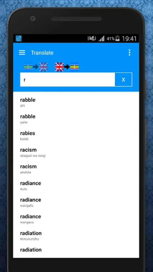 English Swahili and Swahili English, with bilingual audio service providing correct pronunciation, tens of thousands of words available, with the option of adding your own words.