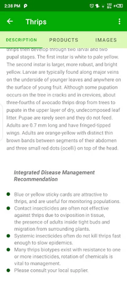 The app includes four fruit crops developed by the Horti-LIFE project (Avocado, Banana, Mango and Papaya). The app includes information on 9 pests, 17 diseases, and 5 disorders, as well as images of the symptoms, IPM recommendations, and a list of products that are thought to be effective for control. Recommendations are based on information on the manufacturer's label as well as performance data from Farmers Field School research and Extension trials.