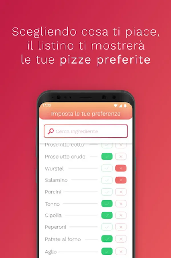 Furthermore, if you have allergies or simply don't like certain ingredients, all you have to do is select them on the screen. All the pizzas will then be filtered so as to show you only those that attract your attention.