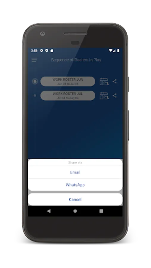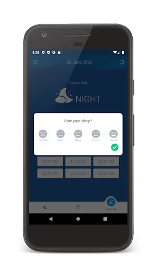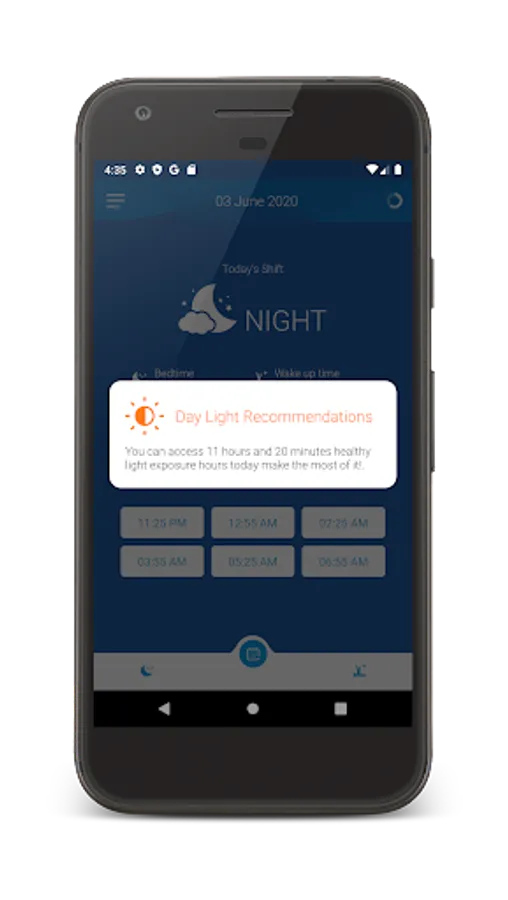 A work scheduler which supports your health by using your own personalized work/activity rota to provide sleep, food, daylight, blue and melatonin enhancing low tone light. This APP links to accurate daylight tracking specific to your location. Useful features include a sleep calculator, roster sharing, event look up against work roster and trend reporting.